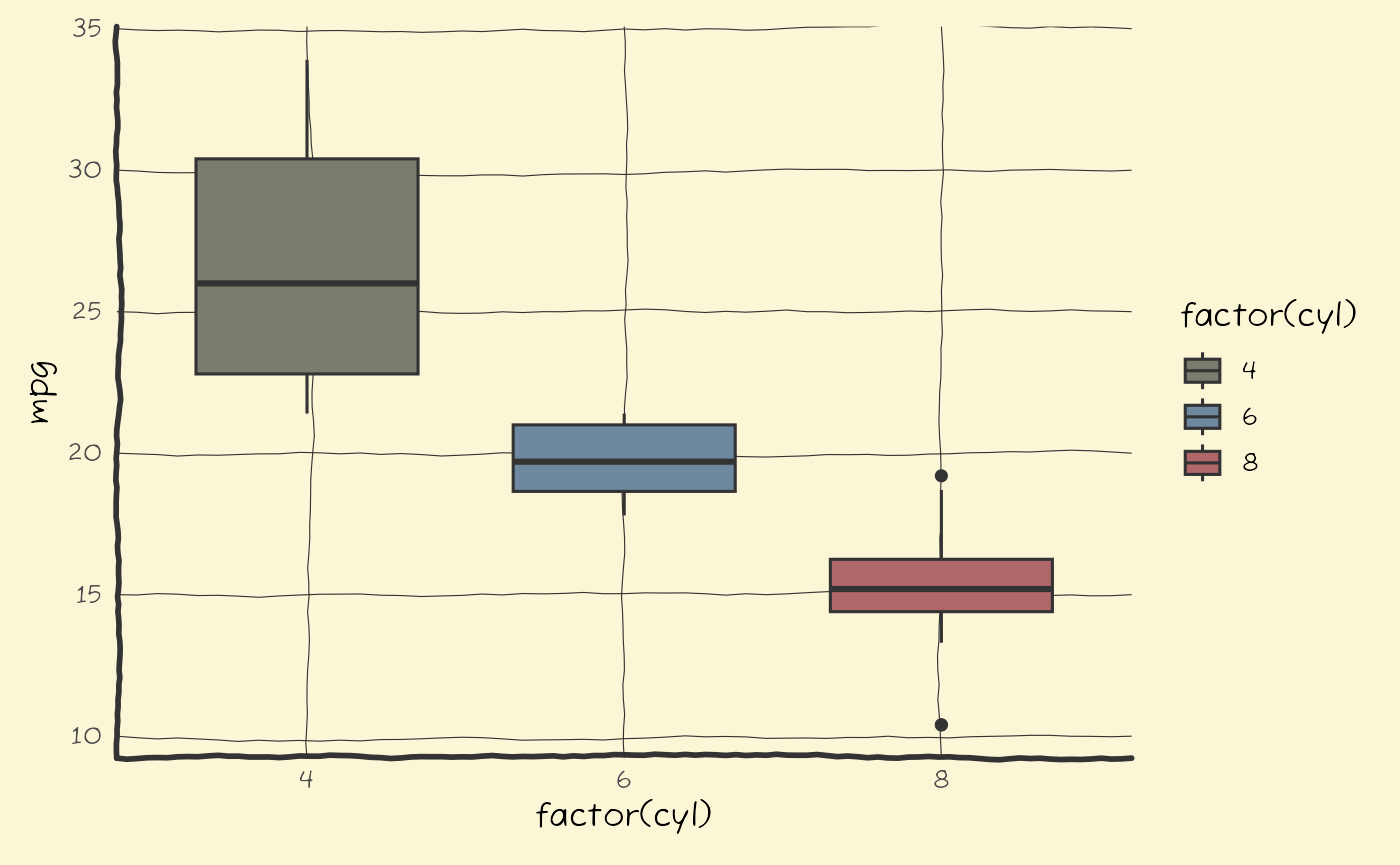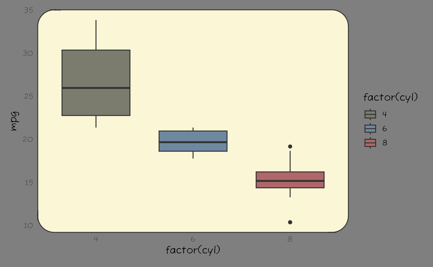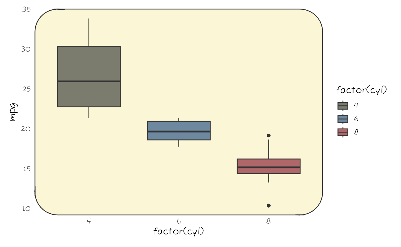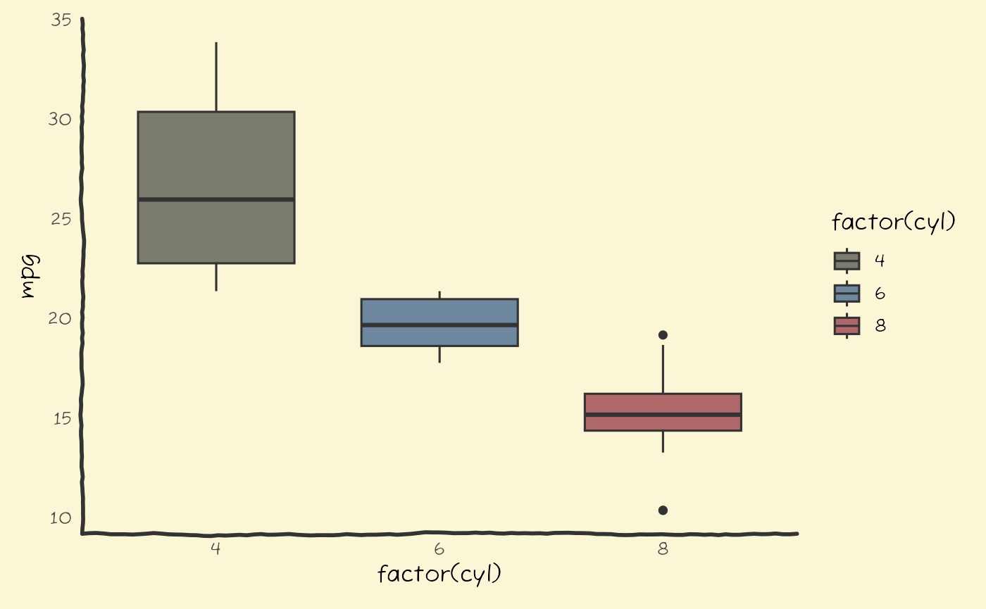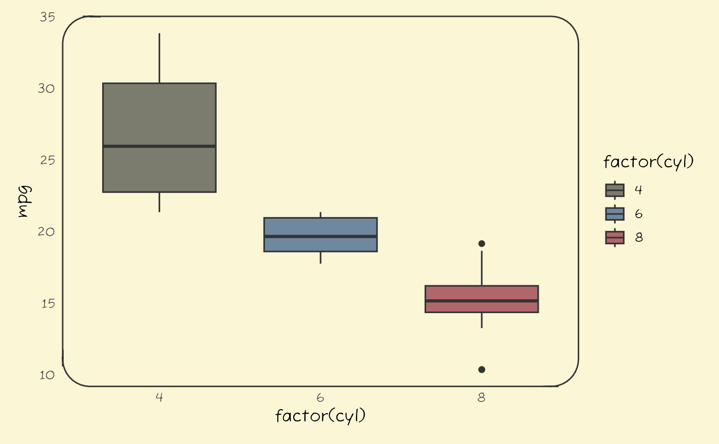 ggplot(mtcars, aes(factor(cyl), mpg, fill = factor(cyl))) +