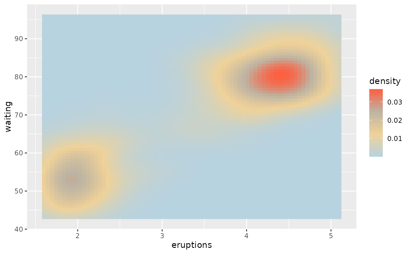 ggplot(faithfuld, aes(eruptions, waiting, fill = density)) +